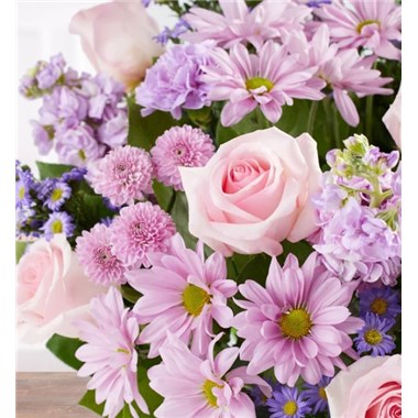 EXCLUSIVE Just like a daydream. Our delightful lavender bouquet is gathered with accents of pink and lush greenery in a glass vase tied with a lavender satin ribbon that complements the delicate beauty of the blooms.